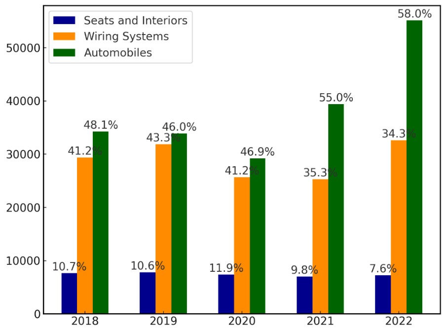 Figure 1. Morocco’s automotive exports by product category. Data in million dirhams (1 dirham = 0.1 euro). Annotations on bars indicate the percentage of total automotive exports. Source: Lodi 2026; data from Agence Marocaine pour le Développement de l’Investissement et des Exportations (AMDIE).