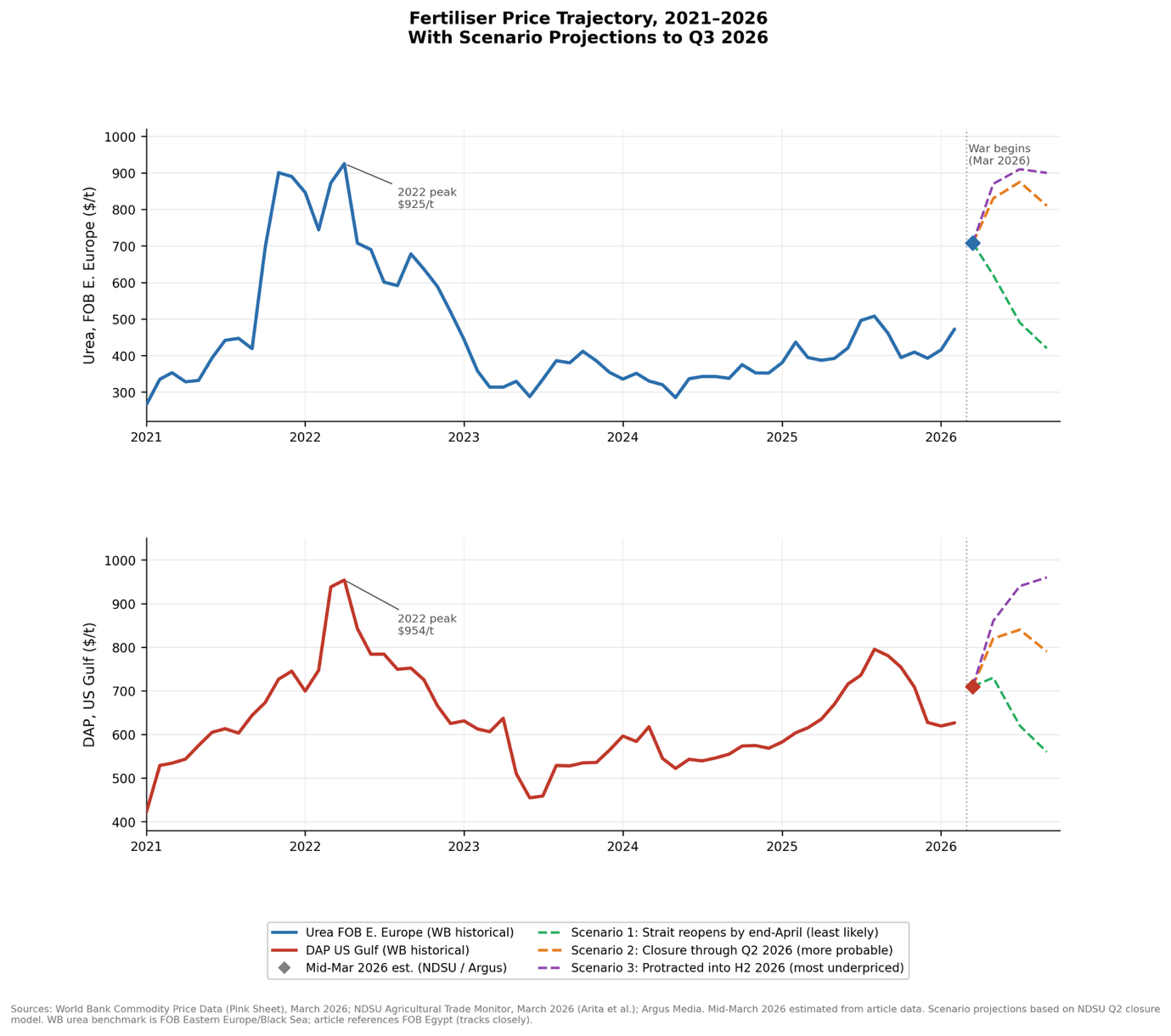 The comparison to 2022 is instructive: that year, urea ultimately reached approximately $925 per tonne and DAP exceeded $1,000 per tonne. Current prices remain well below those levels, but the underlying drivers suggest continued upward pressure. Research from North Dakota State University’s (NDSU) Agricultural Trade Monitor indicates that a Strait closure persisting through the second quarter could push DAP past $800 per tonne and urea toward $850–900 per tonne.[8]